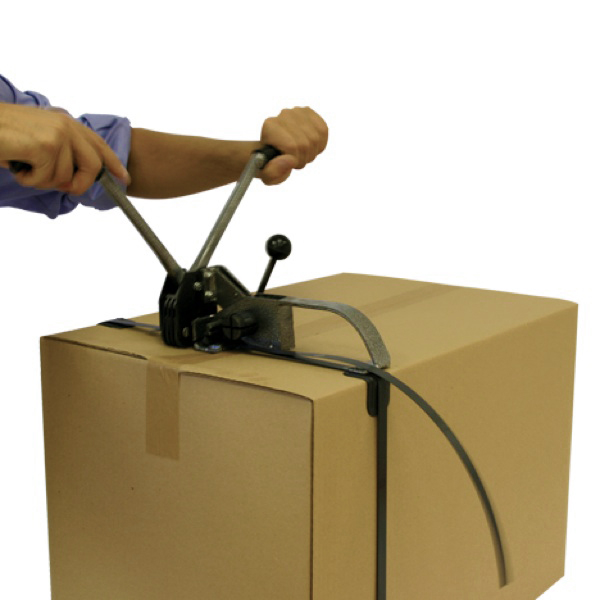 Kézi pántoló készülék műanyag pántszalag és fém pánthüvely együttes használatával kartondobozok zárására, raklapra történő rögzítésére.
